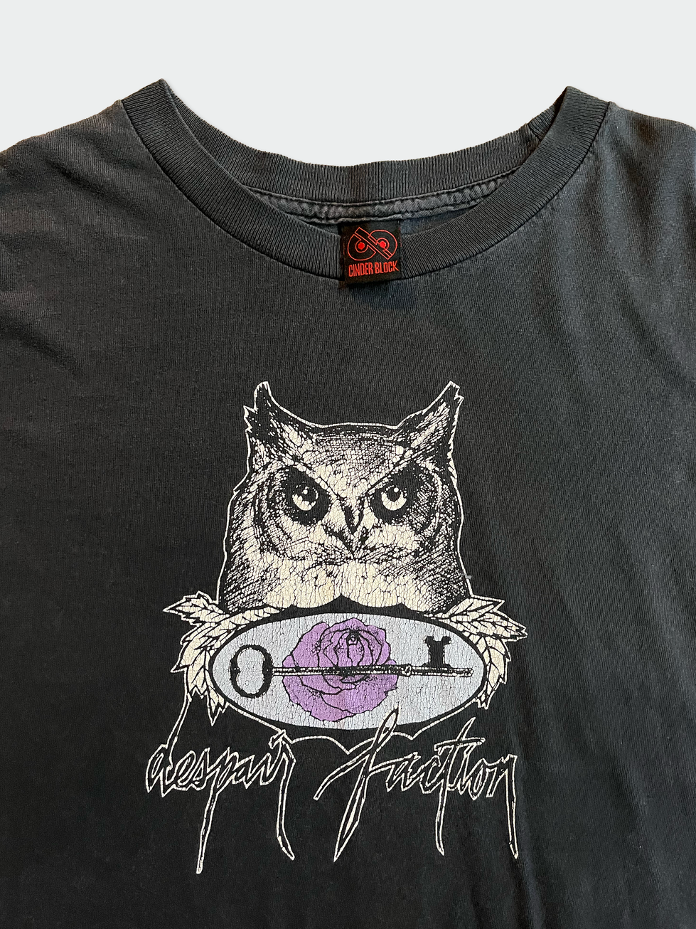 Fantastic AFI shirt from the early-mid 2000s, featuring an Owl + Key graphic originally available exclusively to members of the Despair Faction official fan club website